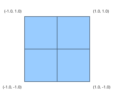 In this tutorial we rely on the normalized box again. Visible vertices must be inside the box so that viewport transformation will map them to the visible coordinates of the window. When looking down the negative Z axis this box looks like that: