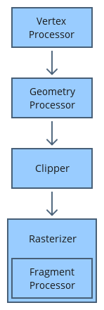 The next stage in the pipe is the clipper. This is a fixed function unit with a straightforward task - it clips the primitives to the normalized box we have seen in the previous tutorial. It also clips them to the near Z and the far Z planes. There is also the option to supply user clip planes and have the clipper clip against them. The position of vertices that have survived the clipper is now mapped to screen space coordinates and the rasterizer renders them to the screen according to their topology. For example, in the case of triangles this means finding out all the points that are inside the triangle. For each point the rasterizer invokes the fragment processor. Here you have the option to determine the color of the pixel by sampling it from a texture or using whatever technique you desire.