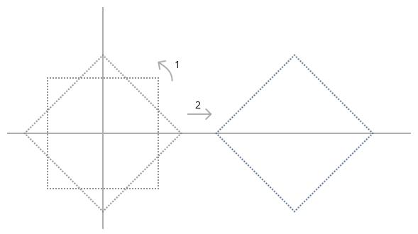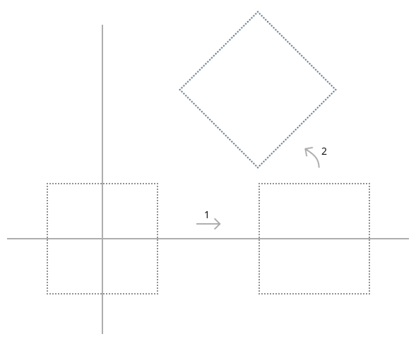 How do you order the matrices when generating N? The first thing you need to remember is that the vector is initially multiplied by the matrix on the far right of the series (in our case - M0). Then the vector is transformed by each matrix as we travel from the right hand side to the left hand side. In 3D graphics you usually want to scale the object first, then rotate it, then translate it, then apply camera transformation and finally project it to 2D. Let's see what happens when you rotate first and then translate: