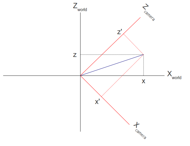 Take another look at the picture above. We can say that the world coordinate system is defined by the three linearly independent unit vectors (1,0,0), (0,1,0) and (0,0,1). Linearly independent means that we cannot find x,y and z that are not all zeros such that x*(1,0,0) + y(0,1,0) + z*(0,0,1) = (0,0,0). In more geometrical terms this means that any pair of vectors out of these three defines a plane which is perpendicular to the third vector (plane XY is perpedicular to Z axe, etc). It is easy to see that the camera coordinate system is defined by the vectors (1,0,-1), (0,1,0), (1,0,1). After normalizing these vectors we get (0.7071,0,-0.7071), (0,1,0) and (0.7071,0,0.7071).