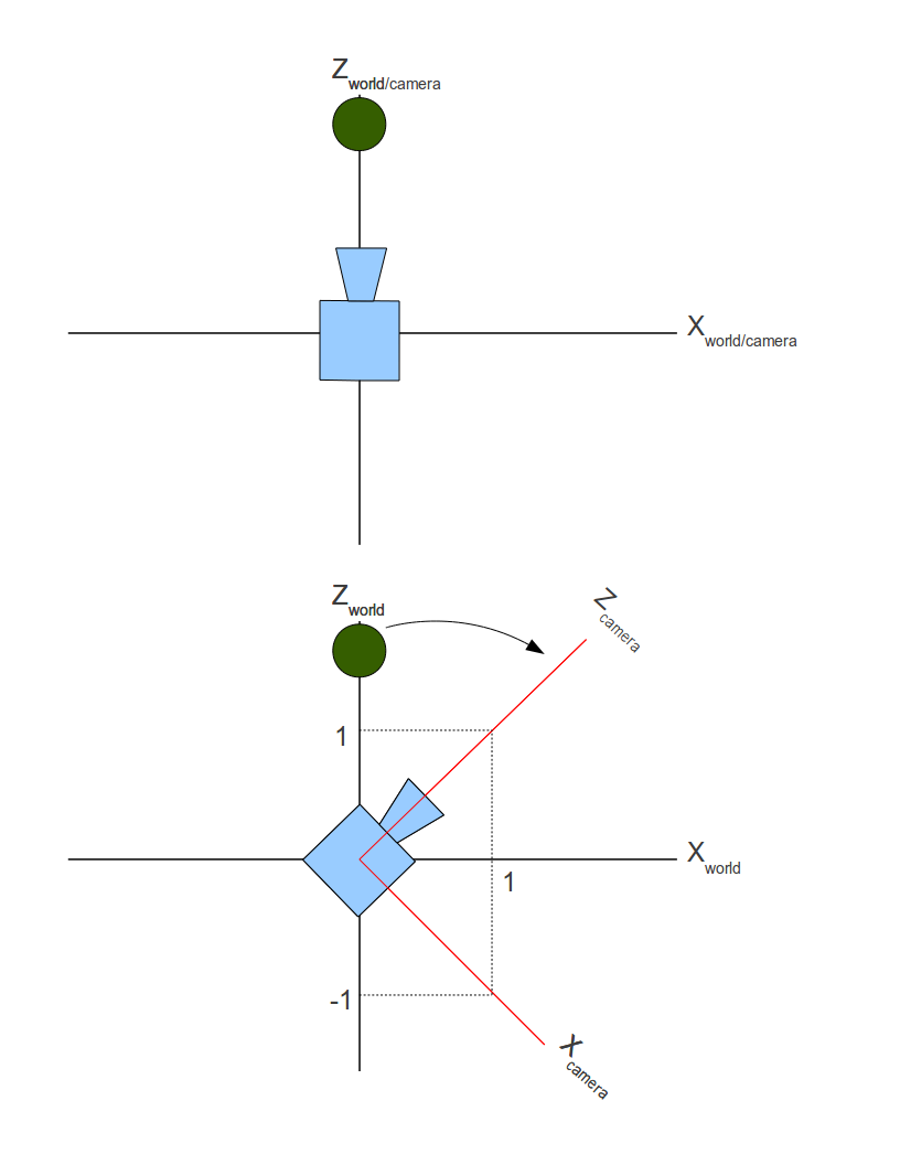 The green ball is located on (0,y,z) in world space. In camera space it is located somewhere in the upper left quadrant of the coordinate system (i.e. it has a negative X and a positive Z). We need to find out the location of the ball in camera space. Then we can simply forget all about the world space and use only the camera space. In camera space the camera is located at the origin and looking down the Z axe. Objects are specified relative to the camera and can be rendered using the tools we have learned.