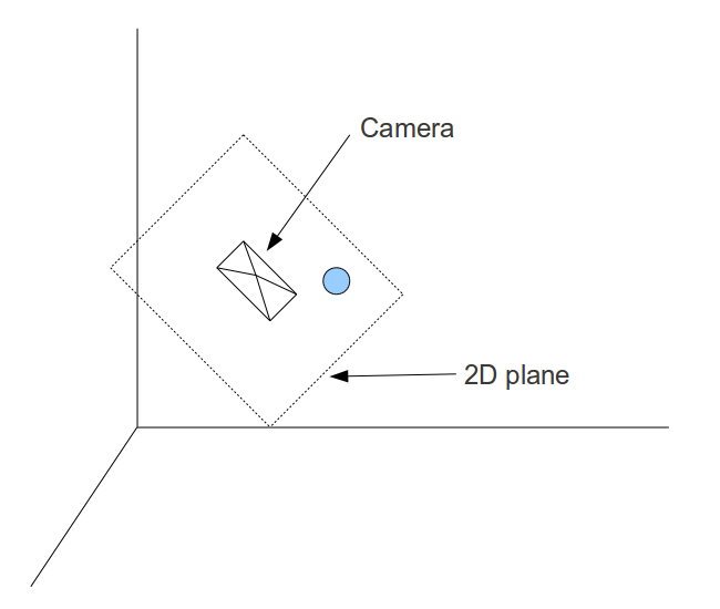In the following picture we see the camera positioned somewhere with its back to us. There is a virtual 2D plane before it and the ball is projected into the plane. The camera is tilted somewhat so the plane is tilted accordingly. Since the view from the camera is limited by its field of view angle the visible part of the (endless) 2D plane is the rectangle. Anything outside it is clipped out. Getting the rectangle onto the screen is our target.