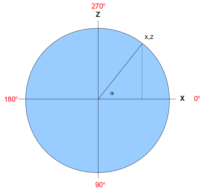 The target vector is (x,z) and we want to find the horizontal angle which is represented by the letter alpha (the Y component is relevant only for the vertical angle). Since the length of the radius of the circle is 1 it is very easy to see that the sine function of alpha is exactly z. Therefore, calculating the asine of z will provide alpha. Are we done? - not yet. Since z can be in the range [-1,1], the result of asine is -90 degrees to +90 degrees. But the range of the horizontal angle is 360 degrees. In addition, our quaternion does rotation clockwise. This means that when we rotate 90 degrees with the quaternion we end up with -1 on the Z axis which is opposite to the actual sine of 90 degrees (which is 1). IMHO, the easiest way to get this right is to always calculate the asine function using the positive value of Z and combine the result with the specific quarter of the circle where the vector is located. For example, when our target vector is (0,1) we calculate the asine of 1 which is 90 and substract it from 360. The result is 270. The asine range of 0 to 1 is 0 to 90 degrees. Combine that with the specific quarter of the circle and you get the final horizontal angle.