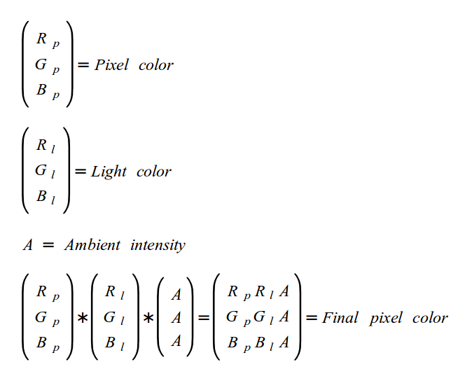 We will specify the color of light sources as a trio of floating point values in the range [0-1]. By multiplying the color of light by the color of the object we get the reflected color. However, we also want to take the ambient intensity of light into account. Therefore, the ambient intensity will be specified as a single floating point value in the range [0-1] which will also be multiplied by all channels of the reflected color that we've just calculated. This will be the final color. The following equation summarizes the calculation of ambient light: