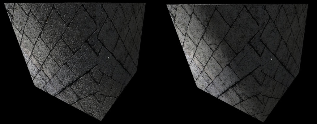 Our lighting technique results are not too bad. The light is nicely interpolated over the model and conveys a sense of realism to the scene. This, however, can be improved tremendously. In fact, the same interpolation is actually an obstacle because sometimes, especially when the undelying texture represents a bumpy surface, it makes it look too flat. As an example, take a look at the following two images: