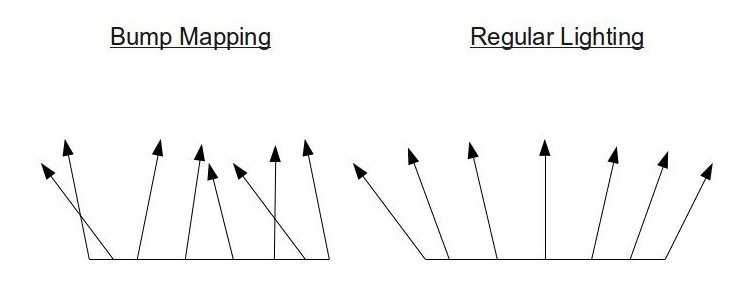 The idea behind normal mapping is that instead of interpolating the vertex normals across the triangle face (which creates the smoothness we are trying to get rid off) they can simply be sampled from a texture. This represents the real world better because most surfaces (especially the ones we are interested in for gaming) are not that smooth such that light will be reflected back in accordance with the way we interpolate the normals. Instead, the bumps on the surface will make it reflect back at different directions, according to the general direction of the surface at the specific location where the light hits. For each texture these normals can be calculated and stored in a special texture which is called a normal map. During lighting calculations in the fragment shader the specific normal for each pixel is sampled and used as usual. The following images show the difference between the normals in regular lighting and normal mapping: