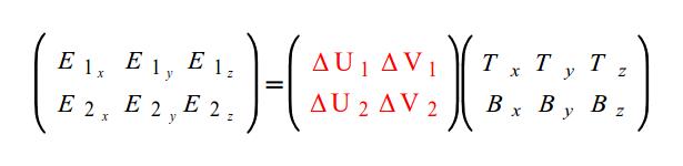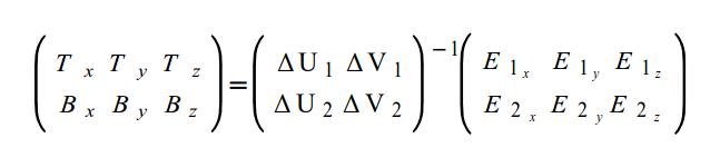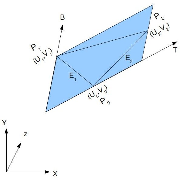 We want to find the vectors T (representing the tangent) and B (representing the bitangent) in object space. We can see that the two triangle edges E1 and E2 can be written as a linear combination of T and B: