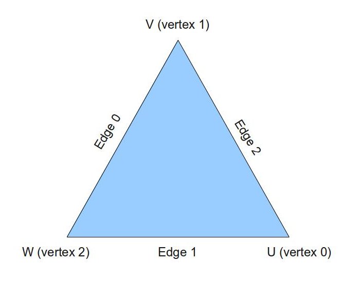 After generating the output patch we calculate the TLs. The TLs can be set differently for each output patch. OpenGL provides two builtin arrays of floating points for the TLs: gl_TessLevelOuter (size 4) and gl_TessLevelInner (size 2). In the case of a triangle domain we can use only the first 3 members of gl_TessLevelOuter and the first member from gl_TessLevelInner (in addition to the triangle domain there are also the quad and isoline domain that provide different access to arrays). gl_TessLevelOuter[] roughly determines the number of segments on each edge and gl_TessLevelInner[0] roughly determines how many rings the triangle will contain. If we designate the triangle vertices as U, V and W then the corresponding edge for each vertex is the one which is opposite to it: