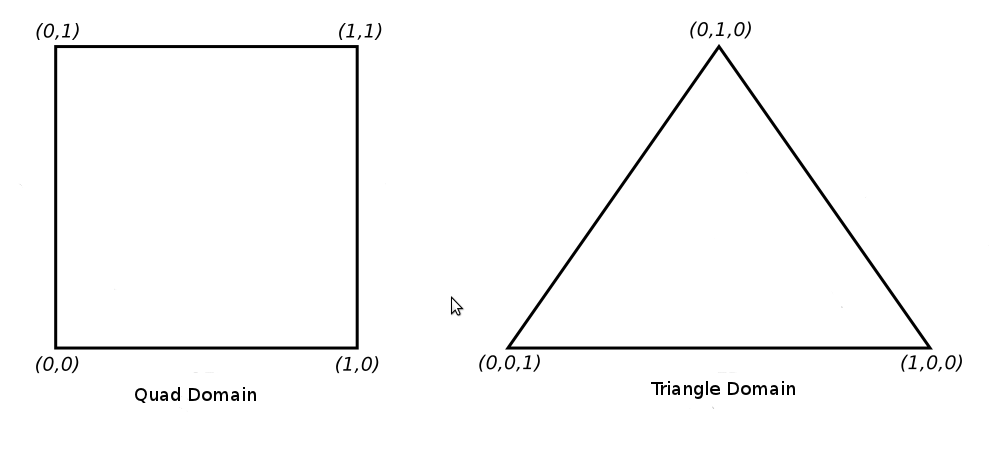 After the TCS finishes comes the fixed function PG whose job is to do the actual subdivision. This is probably the most confusing point for newcomers. The thing is that the PG doesn't really subdivides the output patch of the TCS. In fact, it doesn't even have access to it. Instead, it takes the TLs and subdivides what is called a Domain. The domain can either be a normalized (in the range of 0.0-1.0) square of 2D coordinates or an equilateral triangle defined by 3D barycentric coordinates: