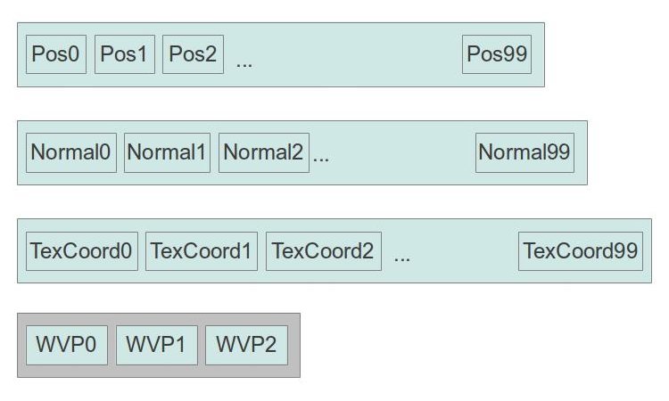 What we have here is a model that contains 100 vertices. Each vertex has a position, normal and texture coordinates. Each of these three data items has its own vertex buffer. In addition, we have a fourth vertex buffer that contains three WVP matrices. The plan is to draw the 100 vertices while applying the first WVP matrix on each of their positions, then draw them again using the second WVP matrix and then with the third matrix. We will do this in one draw call instead of three. The WVP matrix will go into an input variable of the vertex but since the fourth VB is marked as having instance data the matrix will not change until all the vertices have been drawn.