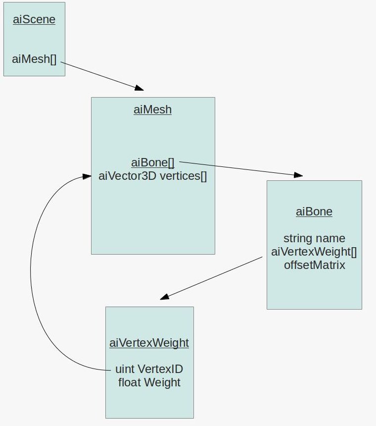 The vertex weight array is where things start to become interesting. Each entry in this array contains an index into the array of vertices in the aiMesh (remember that the vertex is spread across several arrays with the same length) and a weight. The sum of all vertex weights must be 1 but to find them you need to walk through all the bones and accumulate the weights into a kind of list for each particular vertex.