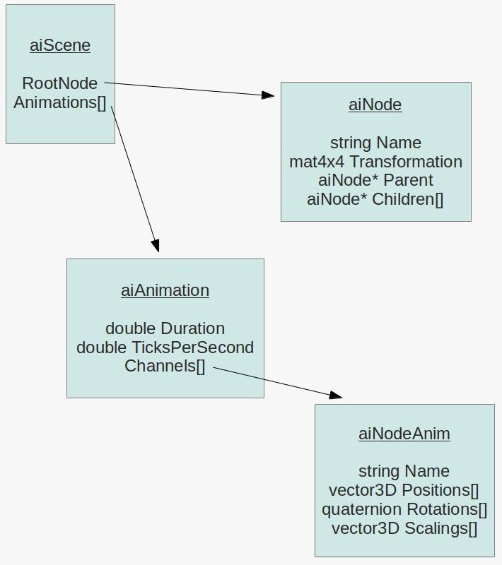 The last piece of the puzzle is the aiAnimation array which is also stored in the aiScene object. A single aiAnimation object represents a sequence of animation frames such as "walk", "run", "shoot", etc. By interpolating between the frames we get the desired visual effect which matches the name of the animation. An animation has a duration in ticks and the number of ticks per second (e.g 100 ticks and 25 ticks per second represent a 4 second animation) which help us time the progression so that the animation will look the same on every hardware. In addition, the animation has an array of aiNodeAnim objects called channels. Each channel is actually the bone with all its transformations. The channel contains a name which must match one of the nodes in the hierarchy and three transformation arrays.
