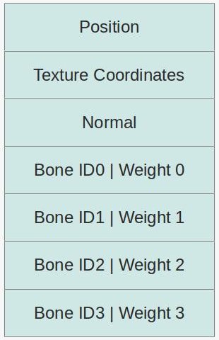 The first stage is to augument the vertex buffer with per vertex bone information. There are several options available but what we are going to do is pretty straightforward. For each vertex we are going to add an array of slots where each slot contains a bone ID and a weight. To make our life simpler we will use an array with four slots which means no vertex can be influenced by more than four bones. If you are going to load models with more bones you will need to adjust the array size but for the Doom 3 model that is part of this tutorial demo four bones are enough. So our new vertex structure is going to look like this: