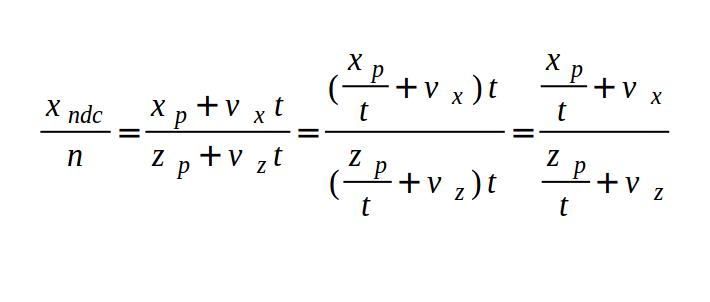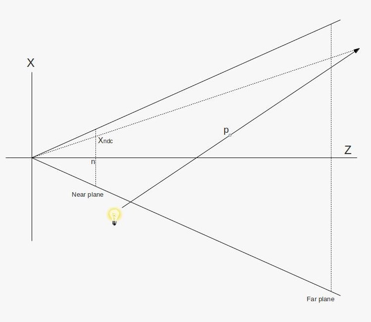 What we see is a picture of the frustum taken from above. The light bulb emits a ray which goes through point 'p' and continues to infinity. In other words, 'p' is extended to infinity. Obviously, at infinity the position of point p is simply (infinity, infinity, infinity), but we don't care about that. We need to find a way to rasterize the triangles of the shadow volume which means we must project its vertices on the projection plane. This projection plane is in fact the near plane. While 'p' is extended to infinity along the light vector we can still project it back on the near plane. This is done by the dotted line that goes from the origin and crosses the light vector somewhere. We want to find 'Xp' which is the X value of the point where that vector crosses the near plane.