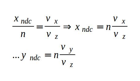 So this is how we find the projection of 'p' at infinity on the near plane. Now here's a bit of magic - turns out that to calculate Xp and Yp according to the above we just need to multiply the vector (Vx, Vy, Vz, 0) (where 'V' is the vector from the light source to point 'p') by the view/projection matrix and apply perspective divide on it. We are not going to prove it here by you can try this yourself and see the result. So the bottom line is that whenever we need to rasterize a triangle that contains a vertex which was extended to infinity along some vector we simply multiply that vector by the view/projection matrix while adding a 'w' component with the value of zero to it. We will use that technique extensively in the GS below.