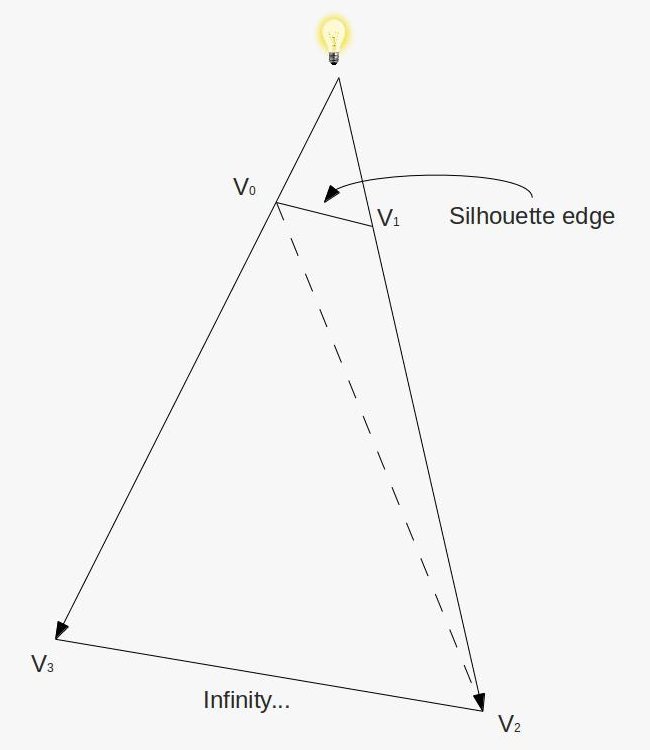 The solution to this problem is to generate a volume which is closed on both sides. This is done by creating a front and a back cap to the volume (the dotted lines in the picture above). Creating the front cap is very easy. Every triangle which faces the light becomes part of the front cap. While this may not be the most efficient solution and you could probably create a front cap using fewer triangles it is definitely the simplest solution. The back cap is almost as simple. We just need to extend the vertices of light facing triangle to infinity (along the vector from the light to each vertex) and reverse their order (else the resulting triangle will point inside the volume).