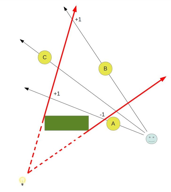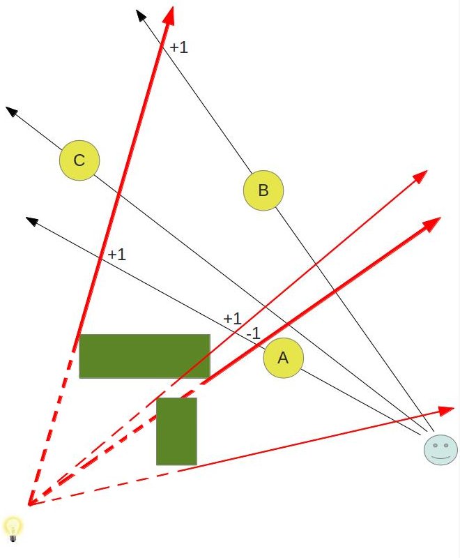 To make it simpler to detect the shadow volume of the second occluder it is marked by thinner red arrows. You can follow the changes to the stencil buffer (marked by +1 and -1) and see that the algorithm works fine in this case as well. The change from the previous picture is that now A is also in shadow.