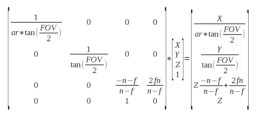So this is basically all the math relevant to the Z buffer handling. Now let's say that we have a Z value that we sampled for the pixel and we want to reconstruct the entire view space vector from it. Everything we need in order to retrace our steps is in the above description but before we dive any further let's see that math again only this time with numbers and matrices rather than words. Since we are only interested in the view space position we can look at the projection matrix rather than the combined WVP (because projection works on the view space position):