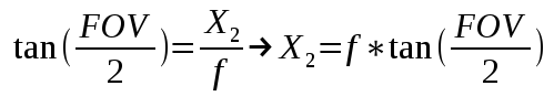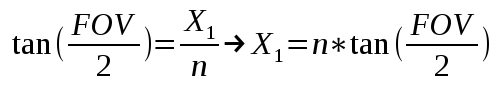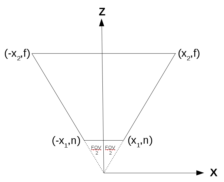 The above image represents an arbitrary cascade (since each cascade on its own is basically a frustum and shares the same field-of-view angle with the other cascades). Note that we are looking from the top down to the XZ plane. We need to calculate X1 and X2: