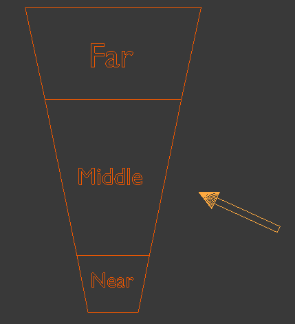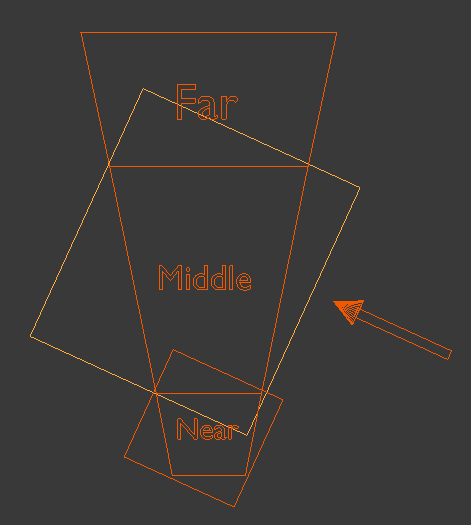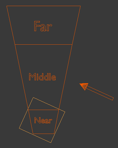 The next step is to split the range from the near plane to the far plane into three parts. We will call this near, middle and far. In addition, let's add the light direction (the arrow on the right hand side):